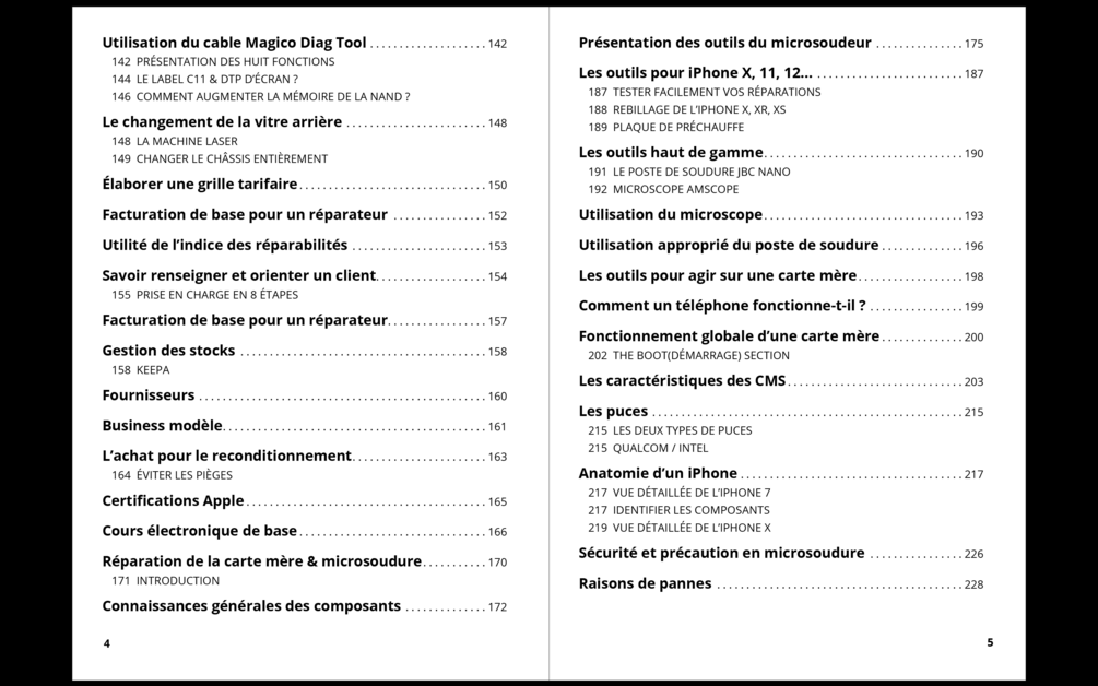La première section vous initie aux bases fondamentales, vous équipant des connaissances nécessaires pour obtenir et utiliser le matériel adéquat, tout en explorant des cas pratiques concrets. Vous découvrirez des techniques de réparation classiques pour des pannes courantes telles que le remplacement d'écrans, de batteries, de ports de charge, ainsi que la résolution de dysfonctionnements internes.